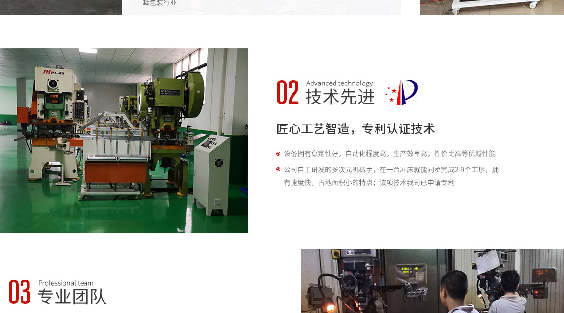 東莞市勝賢機械設(shè)備有限公司,是一家專業(yè)從事金屬制罐包裝行業(yè)的整套自動化設(shè)備和模具開發(fā)、制造與銷售的公司,擁有成熟的技術(shù)和創(chuàng)新開發(fā)能力。我們擁有有一批多年從事設(shè)計、研究開發(fā)的工程師,和設(shè)備、模具制作的技術(shù)人才。不斷推進制罐行業(yè)向高效、環(huán)保、節(jié)能、操作簡易化的方向發(fā)展。 公司主要產(chǎn)品:多次元機械手設(shè)備生產(chǎn):含片盒蓋/底自動生產(chǎn)線,煙盒蓋/底自動生產(chǎn)線,醫(yī)藥盒蓋/底自動生產(chǎn)線,茶葉罐蓋圈/酒罐蓋圈自動生產(chǎn)線,酒罐蓋自動生產(chǎn)線、茶葉罐拍底自動生產(chǎn)線等等。 罐身自動扣骨機生產(chǎn):茶葉罐/酒罐/化妝品罐/內(nèi)衣罐等等. 其中多次元機械手專為兩片盒的生產(chǎn)和三片罐的蓋、底、蓋圈、拍底蓋等的生產(chǎn)而設(shè)計,...